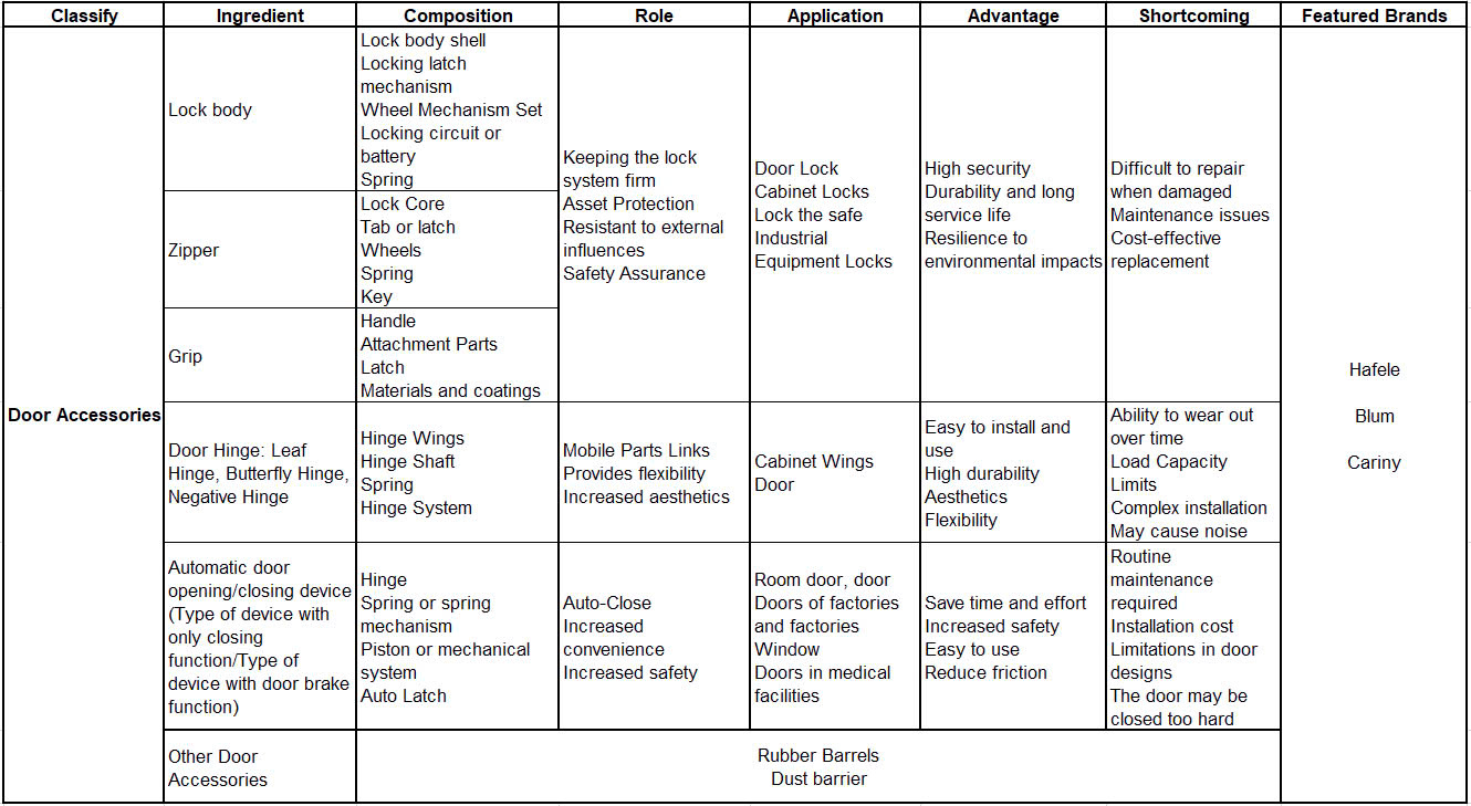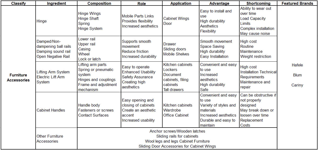 + Hinge system: Includes auxiliary accessories connecting the hinge wings and furniture parts, allowing adjustment of the opening angle.
