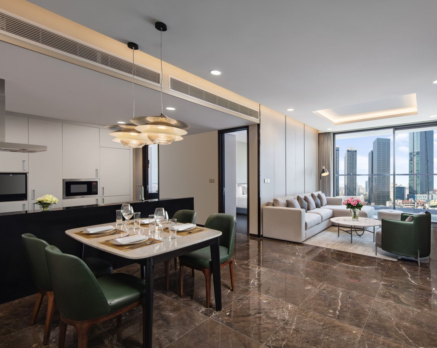 - Boutique Residence bổ sung bếp riêng, phòng khách, phòng làm việc, phù hợp lưu trú dài hạn, đồng thời vẫn được hỗ trợ dịch vụ khách sạn như dọn phòng, giặt là, concierge, ...